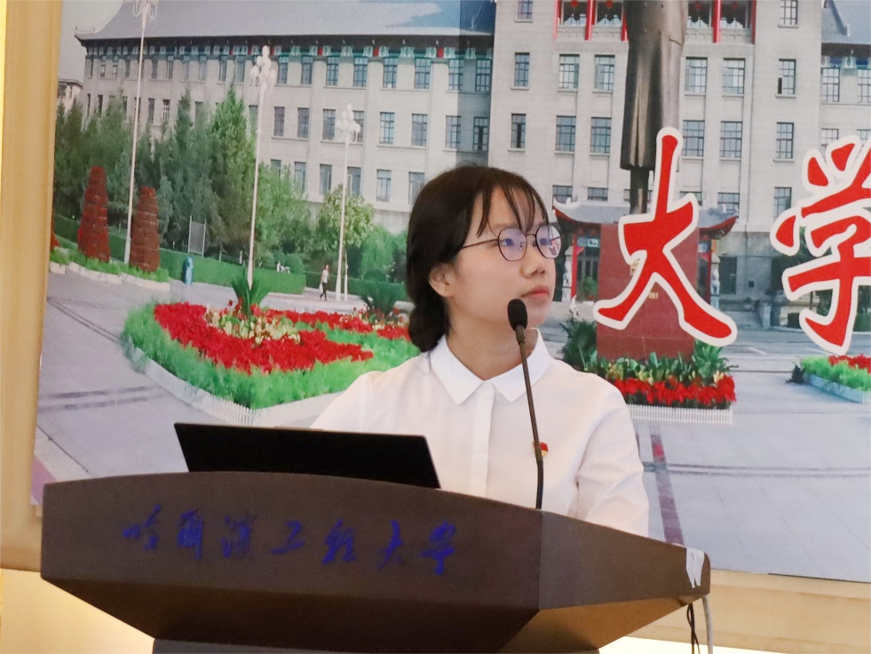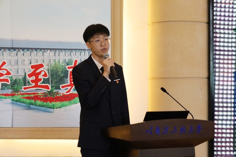 沈美栖从习近平总书记18年5月2日讲述“每个青年都应该珍惜这个伟大时代,做新时代的奋斗者”入手,结合哈军工学员钱七虎院士高中毕业毅然决然加入哈军工,用自己的一生为国防事业添砖加瓦;以及她前往新疆维吾尔自治区,吉林省延边自治州,黑龙江省抚远市三条线路支教偏远地区的志愿经历,讲述了该怎样以担当之墨写青春奉献。“我们要牢记习近平总书记的殷切嘱托,将志愿服务的好品格汇入社会奉献的主旋律,不忘初心,接续奋进!”沈美栖说。
