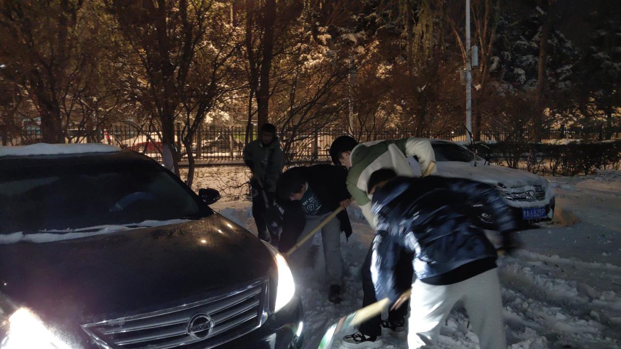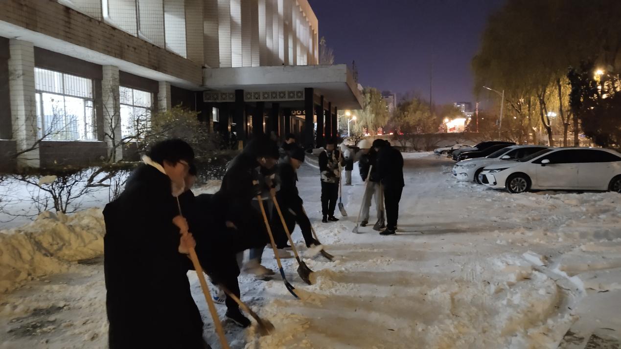 7日晚,院直党支部书记、辅导员董云吉带领研究生清理理学楼前停车场的积雪,帮助受困车辆安全驶离。