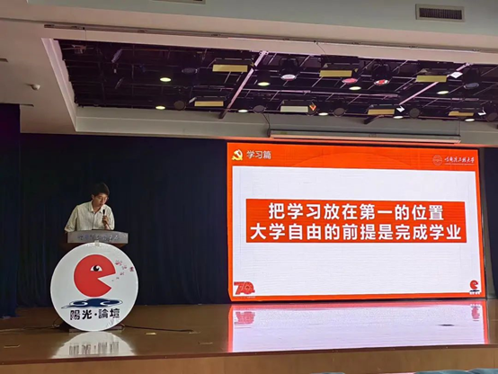 闫佳音作为公司学习部部长、学习助教,学习成绩排名第一,在学习上有着自己独特的经验。她从学习方法、学风建设两大方面,分享了自己在大学三年高效快乐学习的技巧及加强公司学风建设的创新性做法,鼓励同学们平时认真听讲,明确自身目标、厚积薄发,稳中求进。