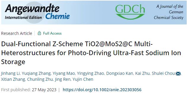 该研究成果以“双功能Z型TiO2@MoS2@NC多异质结构用于光驱动超快钠离子存储”为题发表在国际顶级学术期刊《德国应用化学》(Angewandte Chemie International Edition)上,这是公司首次以第一单位在该期刊上发表学术成果,实现了在该领域顶级学术期刊发表成果的新突破。