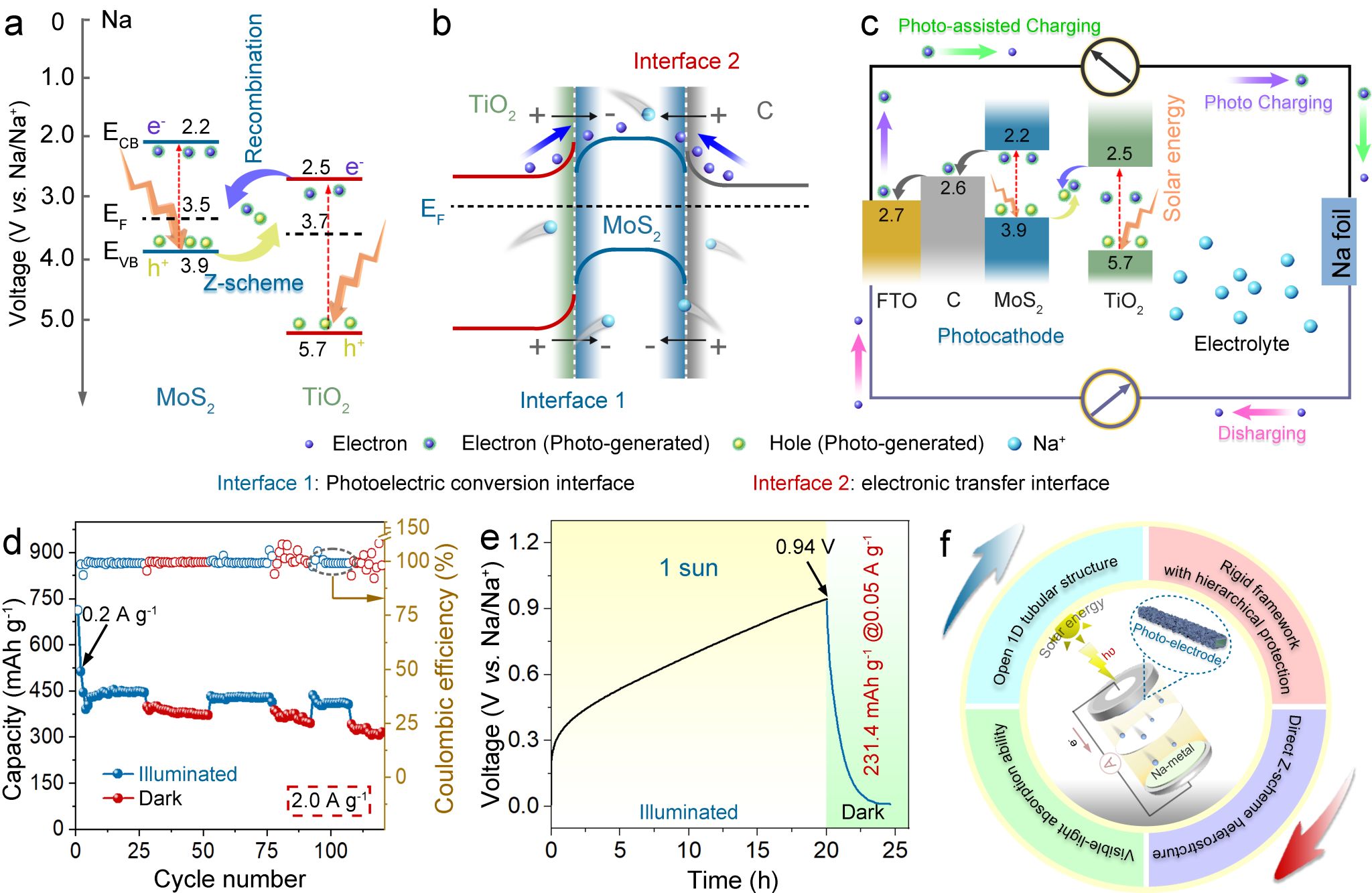 近日,xcsports微纳光电材料与器件课题组构建的兼具光电转换界面和电子传输界面的双功能光电极,成功实现了太阳能充电钠离子电池,并详细阐述了双功能光电池在光照下的储能机理,为储能半导体材料在光电池储能领域的应用提供了理论基础。