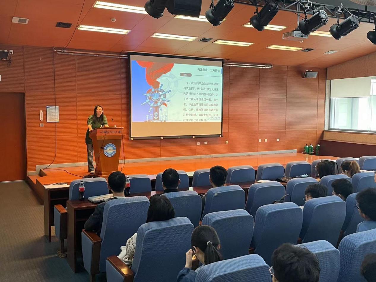 本次讲座旨在增强毕业生对劳动合同法的认识,进一步提高同学们的法律风险防范意识。许锬以毕业生就业“三方协议”中的违约金、试用期、劳动期限、社会保障和福利待遇等内容,结合我国劳动法、劳动合同法的内容给同学们生动讲解了关于劳动者切身利益的问题。她从劳动关系、劳动者的主要权利、三方协议、劳动合同等方面为同学们讲解在求职路上如何维护合法权益,如何规避风险。通过案例分析和交流互动,引导同学们关注针对签订就业合同应注意的问题,与单位之间发生劳动争议时应怎样维护自身合法权益。