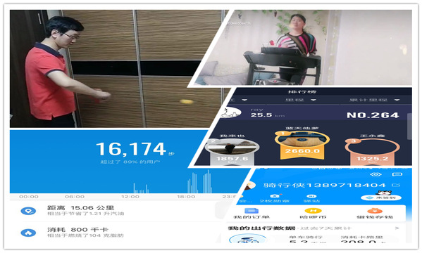 居家开展健身活动,以照片、短视频等方式记录自己运动健身活动,并发送到办公室微信群、朋友圈、抖音等媒体平台完成健身打卡。活动项目包括走步、跑步、骑车、乒乓球、划船等。