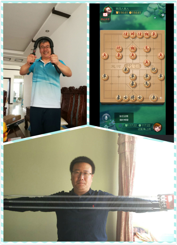 大学物理教研部的全体成员每周至少三天使用拉力器进行健身,并进行健身打卡。每次使用拉力器运动20分钟,并拍照片上传。